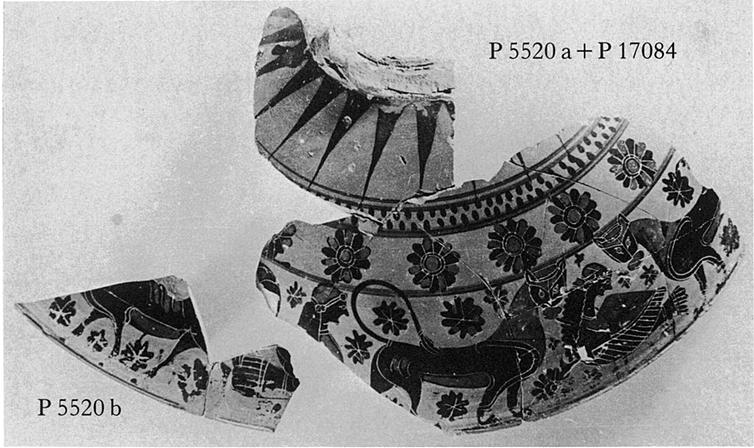 | Description: | a) Part of rim with a lion, head missing, walking to right; behind him the head of a siren? b) Rim piece of same lid with the body of a bull walking left. Incised lines and red paint used on the animals and in the rosettes that fill in the gaps in the broad animal band. Above this band and separated from it by a brown painted line, circle of more elaborate rosettes. Above this, dots. Inside unglazed. Attic Animal Style. | |