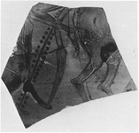 | Description: | From a large open pot, glazed inside. The back end of a horse, right, followed by a maenad dancing; one leg of a nude male figure seated on the rump of the horse is preserved. Tendril in field. Return of Hephaistos to Olympos? The glaze inside black, rather dull, somewhat streaked. Outside, fired red to black; the black much peeled. | |