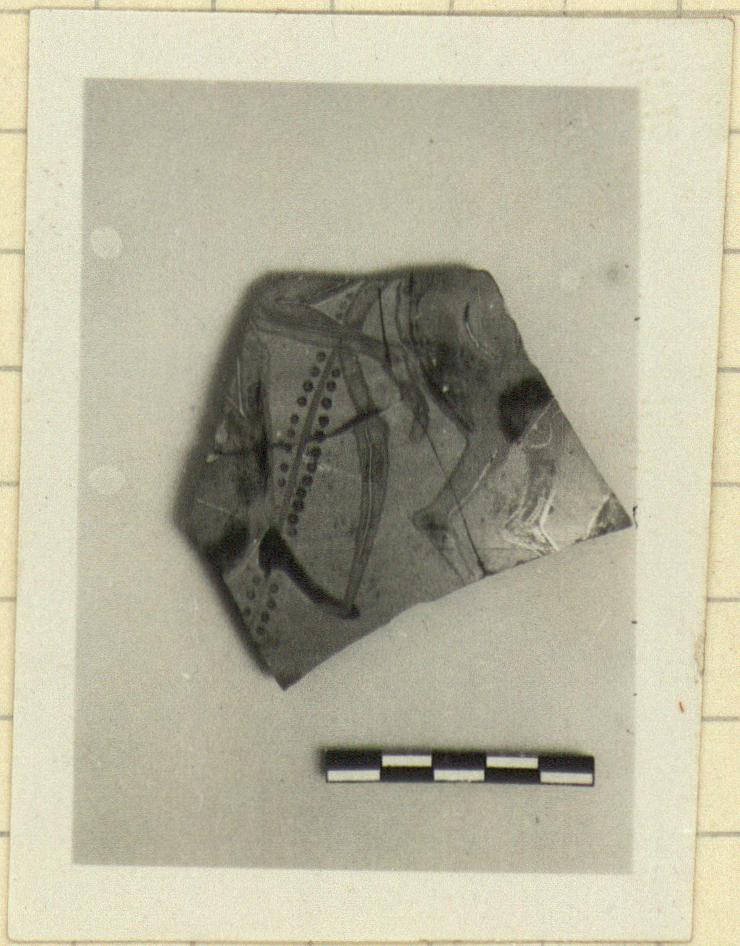 | Description: | From a large open pot, glazed inside. The back end of a horse, right, followed by a maenad dancing; one leg of a nude male figure seated on the rump of the horse is preserved. Tendril in field. Return of Hephaistos to Olympos? The glaze inside black, rather dull, somewhat streaked. Outside, fired red to black; the black much peeled. | |
