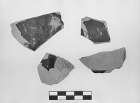 | Description: | Four fragments from a bell krater: a) Face of bearded man left; object in front of him, phiale(?). b) Animal's legs(?). c) Bit of drapery. d) From the handle. Possibly same pot as P 3037 and P 9757. | |