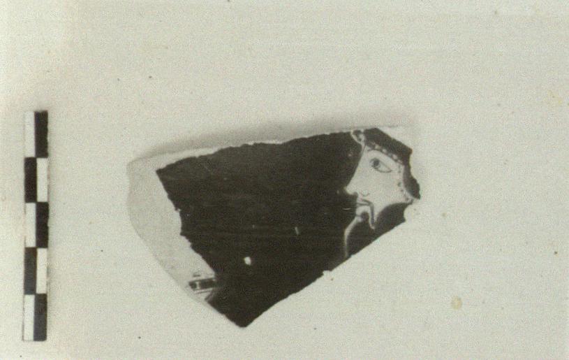 | Description: | Four fragments from a bell krater: a) Face of bearded man left; object in front of him, phiale(?). b) Animal's legs(?). c) Bit of drapery. d) From the handle. Possibly same pot as P 3037 and P 9757. | |