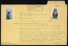 | Description: | The lip missing and large fragments from the body. High ring base; the handle ridged; two grooves at junction of neck and body. Pinkish-buff clay with small bits. The upper part of the body, to well below the point of greatest circumference, was covered with a dull purplish-brown glaze wash, over which were painted spirals in added white. Most of the white has worn off, but the pattern remains since the white served to preserve the glaze wash beneath it. Elsewhere the wash has largely peeled, leaving a speckled yellowish-brown surface. Late Roman D Ware. Cf. bowls of Late Romna D such as P 2274. | |