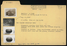 | Description: | Fragments missing from wall and rim. Shallow bowl with wide plain rim tilted slightly inward. Rosette at bottom. Long round-ended petals on body. Pinkish buff clay and red glaze, somewhat peeled. | |
