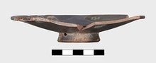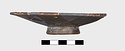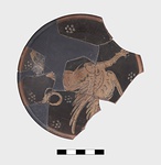 Description:   Shallow saucer on small ring foot; reserved groove around edge. More than half the rim and fragments from the floor missing. A griffin left, with one front paw raised, painted in thinned clay on the black ground, the details incised through to the black. Dot rosettes in added white in field.