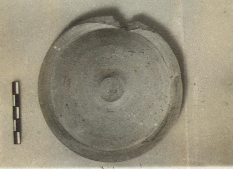 | Description: | Convex round lid with flat rim, flanged underneath. Knob handle broken off. Neatly made. Micaceous pinkish buff clay, slipped. Unglazed. | |