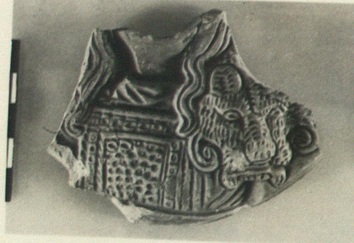 | Description: | The fragment seems to represent the upper part of a draped female figure preserved, in part from neck to waist. A square breast-plate ornamented with dots and gouges is worn over drapery. A long lock of hair hangs down either side of the neck. On the left shoulder is a large lion's head. Pinkish-buff clay; dull red wash outside and over lower part of inside. | |