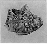 | Description: | The fragment seems to represent the upper part of a draped female figure preserved, in part from neck to waist. A square breast-plate ornamented with dots and gouges is worn over drapery. A long lock of hair hangs down either side of the neck. On the left shoulder is a large lion's head. Pinkish-buff clay; dull red wash outside and over lower part of inside. | |