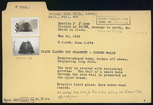 | Description: | Body of beehive shape, broken off above. Projecting ring foot. The body is covered with horizontal grooves. Half of a small hole through the side wall is preserved at the upper break. Metallic black glaze; thin brown wash inside. ADDENDA Fragment added Feb. 1950 from Box 216a giving second hole at top opposite first. | |