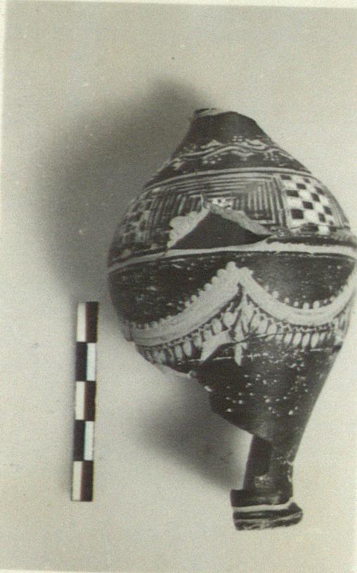 | Description: | Plump fusiform shape; about half of body and all of neck, missing. On shoulder, ivy garland with leaves and berries. Around point of greatest circumference, alternating checkerboard and concentric squares; below, festoons with dots above, pendents below. Black glaze; thinned clay paint with white in checkerboard. Drip of glaze inside. ADDENDA Fragments added Feb. 1950 from Box 216a giving neck and more of shoulder. | |