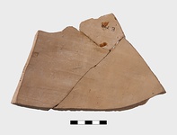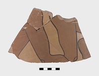 | Description: | a) Fragment of very large pot: Protoattic? Mended from two pieces. Legs of two figures running, passing each other in opposite directions. Painted brown with heavy outlines against buff ground. When found, the surface between the outlines was covered with a soft powdery purple which disappeared when the sherds were placed in water. Where the leg of one figure crosses that of the other, a dim outline indicates that the portions not seen were drawn complete. Pinkish-buff clay, finely finished surface. Inside unpainted. Cf. Praisos plate, Pfuhl (1923), fig. 57. ADDENDA a) Part of a third figure to the right in fragment a). Lustrous black paint outlines; flesh painted in a color that had a soft purple surface when first excavated but that disappeared when the sherds were washed, leaving a dull reddish-brown. Traces of erroneous preliminary drawing, which were scratched away between the left pair of legs and erased and then covered with paint in the other cases. Ca. middle of 7th c. B.C. Ε 790, joining to a). New Grid: I 10; Eponymoi, cut E, Great Drain footing trench, layer V; Nb. p. 1826. Parts of buttocks of two male nude figures back to back. Buff clay, figures outlined with black paint, flesh dull red-brown. 12 July 1967. b) Another small piece [Max. Dim. 0.075; Th. 0.012] found later, does not join; it shows part of an arm or the leg of a smaller person. c) Additional fragment, non-joining (ΟΕ 272), from Metroon Pit, north extension, layer VI, from container 129, Nb. p. 432. The votive deposit at the foot of Areopagus, from which came the other fragments (P 576, ΣΤ 537) lies 150m. to the south. 22 March 1938 [P.H. 0.065; P.W. 0.05]. Wall fragment, broken all around. Parts of four legs(?), outlined in dark brown, filled in with light brown on a reserved ground. Pale yellow clay, with brown grit. | |