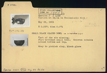 | Description: | Part of the rim missing. Flat bottomed small bowl. Grooves outside around bottom and lip. Gray to pinkish clay, black glaze. ADDENDA Perhaps a one-handled cup. | |