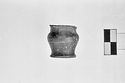 | Description: | Small handleless flat-bottomed stamnos; wheelmarks on bottom. Pinkish buff clay, thin black glaze. | |