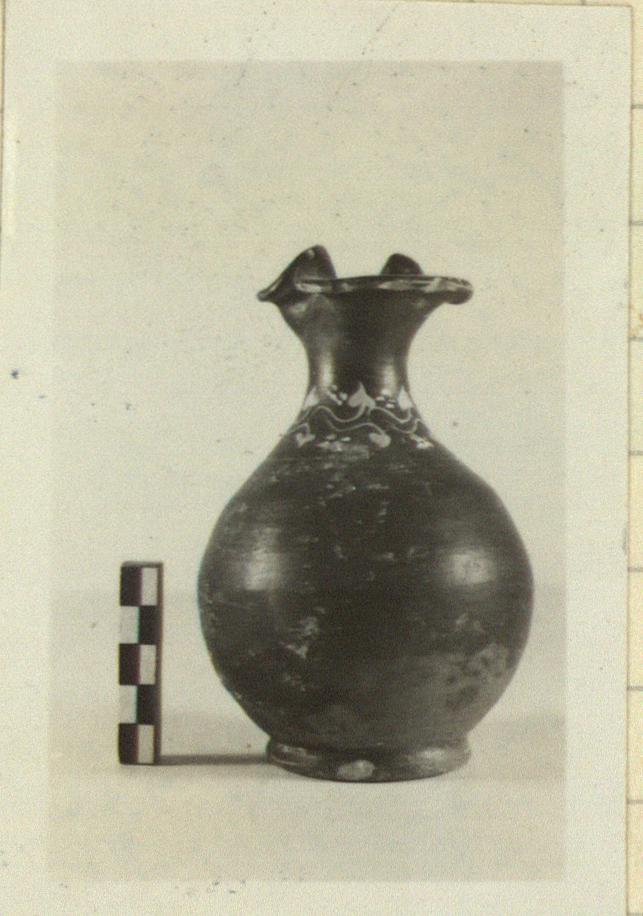| Description: | The handle is missing. Ring foot; exaggerated trefoil mouth. Around base of neck, ivy leaves and berries. The leaves in thinned clay; the berries in white. Glaze black to red. | |