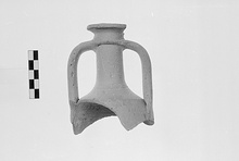 | Description: | The upper part of a very small plain amphora. Flaring lip; the handles start from a ridge below it. Lightly incised on the shoulder: Κ Α Gritty pink to buff clay, unglazed. | |
