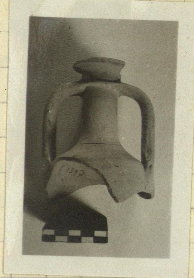 | Description: | The upper part of a very small plain amphora. Flaring lip; the handles start from a ridge below it. Lightly incised on the shoulder: Κ Α Gritty pink to buff clay, unglazed. | |