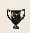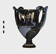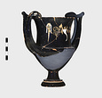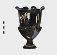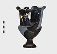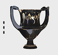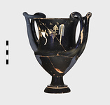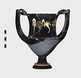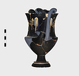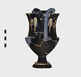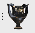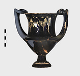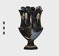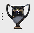 | Description: | Kantharos on high stem with high swung cup handles. Fragments from the lower body and parts of the handles missing. Restored in plaster. Front and back, to each side, a torch in thinned clay, with white ribbons and dots; then a stylized vine leaf and cluster in thinned clay; on either side a white cornucopia crowned with thinned clay leaves. A scraped groove around the foot. Glaze and decoration well preserved. Letters above, on the front: ΦΙΛΙΑΣ | |