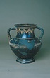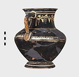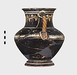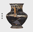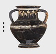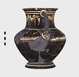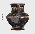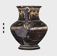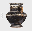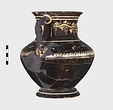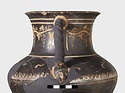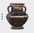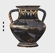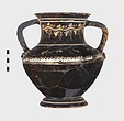 | Description: | Fragments from the lower body and shoulder missing; most of one handle and part of the other. Restored in plaster. High moulded foot with a scraped groove around it. Two scraped grooves below the lip; another at junction of body and shoulder. Twisted handles, with reliefs, women's head, at the lower attachments. On neck, front and back, festoons of grapevine pattern in thinned clay paint. On shoulder, above wave pattern, dolphins, in thinned clay, alternating with white dot rosettes. The waves filled in with white, and purple over the white. Below, two rows of dots, one thinned clay, one white. Black glaze, fairly firm. | |