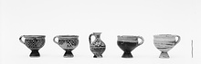 Description:   Intact save for small chips from foot. Small cup with high flaring foot. Concave lip, slightly inset; vertical flat handle. Body, foot, and lower handle, and interior glazed. Narrow band at bottom of foot; lip and most of handle reserved. On the lip, a horizontal zigzag between two horizontal bands. Horizontal stripes on handle.