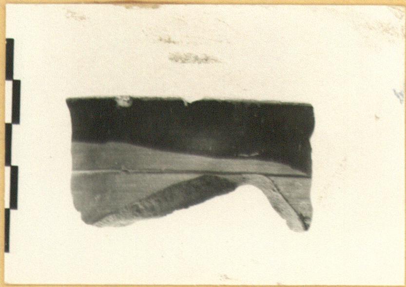 | Description: | Part of upper wall remains. A cylindrical container with heavy walls, flat on top. A low collar around top of wall outside. Fine buff clay, brown glaze around top inside and out. | |