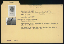 | Description: | Fragment from wall. On outside a sigma in black glaze, and part of the city seal, a double owl. Firm brown clay, polished on outside, partially glazed on inside. | |