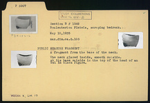 Description:   A fragment from the base of the neck of a closed vase. The neck glazed inside, smooth outside. At its base outside is the top of the head of an owl in black figure.