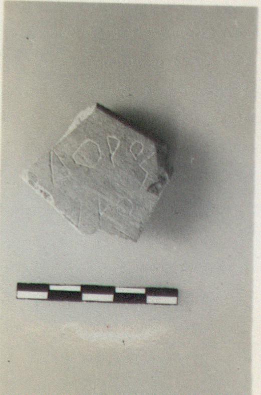 | Description: | Fragment from wall of a plain jar. Letters scratched on the outside: <graphic> | |