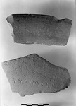 Description:   From a large shallow bowl with flat projecting rim; black glaze inside, rim and outside washed with transparent glaze.