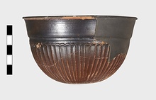 | Description: | Mended from many pieces; about two-thirds preserved. Central medallion: rosette. Sides fluted. Above fluting, broad shallow groove above which is an undecorated band, 0.018m. wide. Scraped grooves colored with miltos just below rim and around base medallion. Attic clay. Glaze blackest near rim outside; stacking(?) line (red) near bottom inside. Lower part fired chocolate brown. Cf. Agora XXII, nos. 327, 352. | |