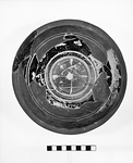 | Description: | Restored in plaster. Rounded bottom with imitation foot made by depressing a circular panel; two grooves around foot. Inside foot, double cross of white and thinned clay paint. On body above grooves, ivy pattern, leaves in thinned clay paint, stems and berries in white; two more grooves; pattern of horizontal white and vertical thinned clay paint strokes alternating. Keel between body and concave high rim; on rim, alternating white and thinned clay paint strokes; grooved below upper edge of out-turned rim. Glaze black to red, inside and out. | |