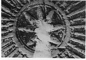 Description:   Unusually large. In medallion on bottom, flower with 8-pointed petals. On body, elongated round-ended petals; no jewels. Below rim, egg pattern and pendent pointed leaves, two grooves on lower rim. Restored in plaster.
