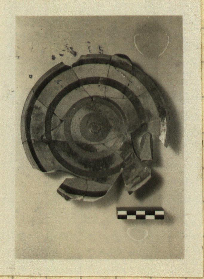 | Description: | Very shallow plate with plain rounded edge; ring foot; two horizontal handles at rim, the attachments preserved, and part of one handle non-joining. Pink to grayish clay; floor decorated with concentric bands, fired red to black. | |