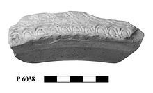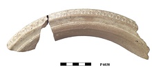 Description:   From large open pot covered with white slip. On the outer face of rim, a stamped egg pattern.