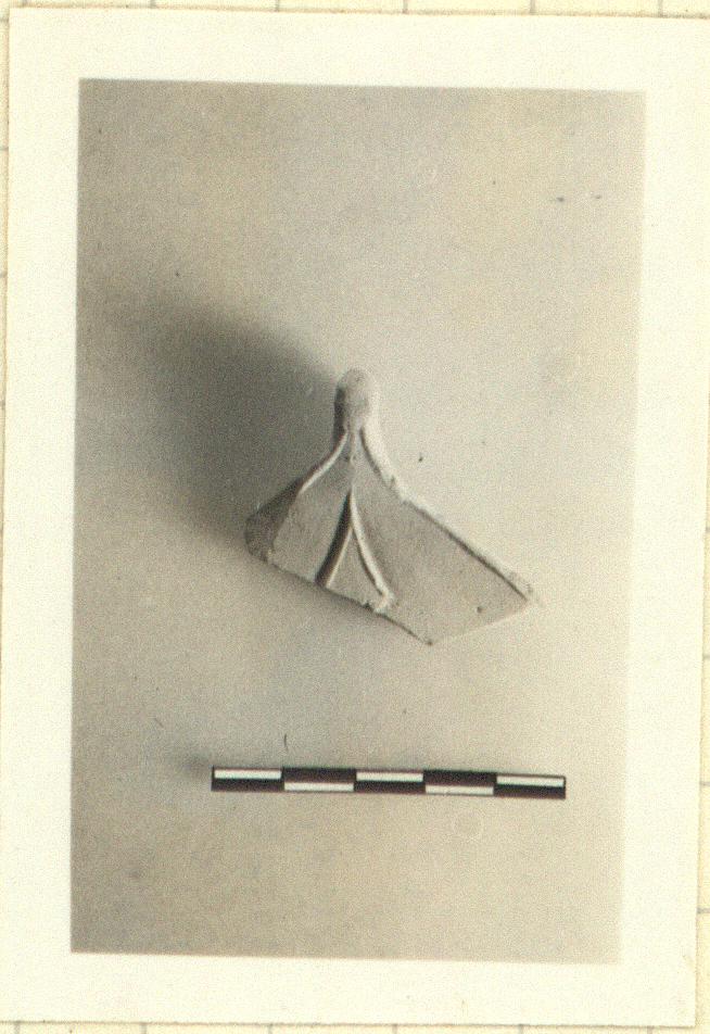 | Description: | A flat triangular piece with a knob at the end. On the upper surface, part of a triangular(?) relief ornament. Pinkish-buff clay; no paint or glaze. | |