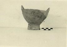 | Description: | Upper parts of handles and fragments from side wall missing; restored in plaster. High base ring; deep bowl; two vertical loop handles rising above rim, their attachments running well down the side wall. Handmade and crude. Coarse gritty clay, fired black inside, dull orange on surface. Rudely burnished both inside and out. Sub-Neolithic or Middle Helladic? | |