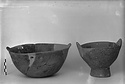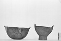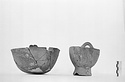 | Description: | Fragments missing from wall, restored in plaster. The vase had been broken in antiquity and mended with string(?) passed through holes drilled along side the fracture. Round bottom; gently out-turned lip. On one side a cleft lug rises from the rim. Coarse clay, fired ash gray. Slipped and polished both inside and out. Slip much flaked. Sub-Neolithic or Middle Helladic? | |