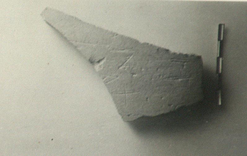 | Description: | Fragment from wall of a large unglazed jar. Letters scratched on outside: <graphic> Micaceous red clay with bits. | |