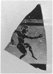 | Description: | Nude figure dancing right with left arm outstretched and left knee raised. The hair is colored purple; details of anatomy very carefully executed. The top of the fragment shows the line of demarcation of the rim. Attic clay; black glaze inside. | |