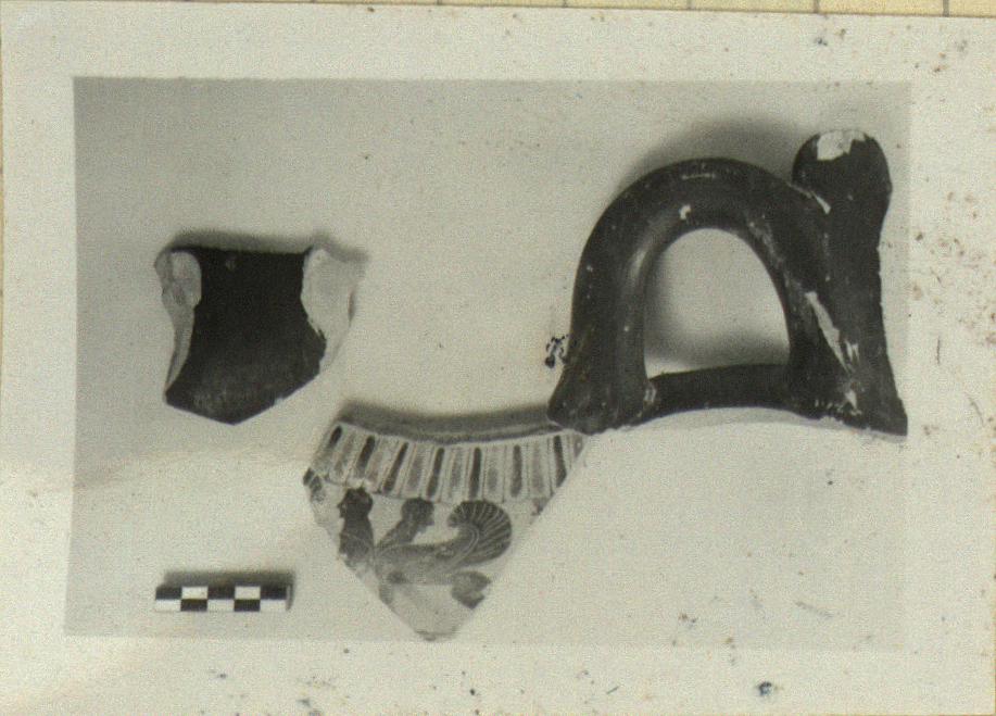 | Description: | Fragments from a very large heavy krater(?), unglazed inside above shoulder. Around base of neck tongues, alternating black and purple. Below, part of an animal band: two sphinxes sejant, facing but with heads turned back. Behind the one to right, the head of a cock left. Added purple for wing bands, ribs and fillets of sphinxes, comb and wattles of cock. b) From the shoulder. Large horizontal double handle, one loop, and a vertical tongue connecting it with the next loop, preserved. Black glaze save for a small area on inner face of handle c) Another fragment from the shoulder, with parts of two handle attachments. | |