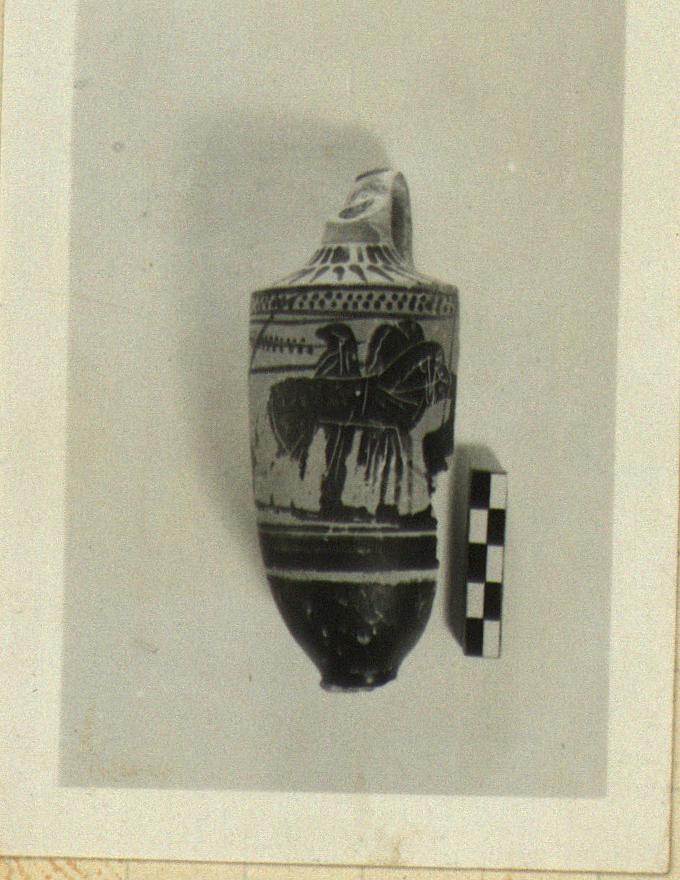| Description: | Mouth, foot and back of body missing. Standing draped figure in biga, right. Behind the horses, another standing draped figure; at right, part of a seated(?) draped figure with spear, left. Tendrils in field. Purple bands below. | |