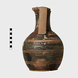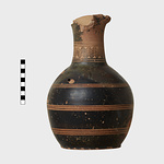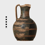 | Description: | Part of lip missing. Trefoil mouth; flat vertical handle. Ring foot. Three triple reserved bands around body. On front of neck, reserved panel with zigzag decoration. Horizontal stripes on handle. Black glaze, somewhat peeled on neck. | |