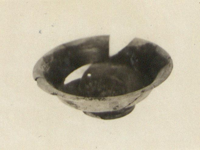 | Description: | Mended from many pieces; bit missing from rim and side. Small bowl; low ring foot badly placed, leveled by lift on one side; out-turned rim. Pinkish-gray clay. Dull black glaze much worn. | |