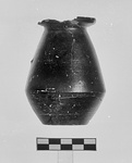 Description:   Mended from several fragments, but complete save for vertical handle broken away, and chips around rim. Small flat bottom; profiled body, greatest circumference below center; rim set back, rising at outer edge.