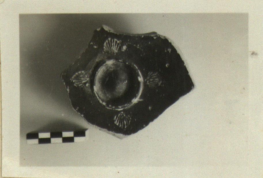 | Description: | Only the center remains. Raised ring inside, no incision around depression. Four stamped conch-shell-shaped palmettes. Dull black glaze. | |