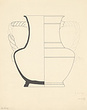 | Description: | Fragmentary. Restored in plaster. Ring foot, squattish body, concave high neck flaring at the lip. Twisted vertical handles with moulded masks at their bases. Incised ring above foot. On shoulder between incised grooves, diminishing rectangles and checkerboard pattern in terracotta paint and white; on neck, front and back, necklaces with pendents in terracotta paint and white. Rather metallic black glaze. | |