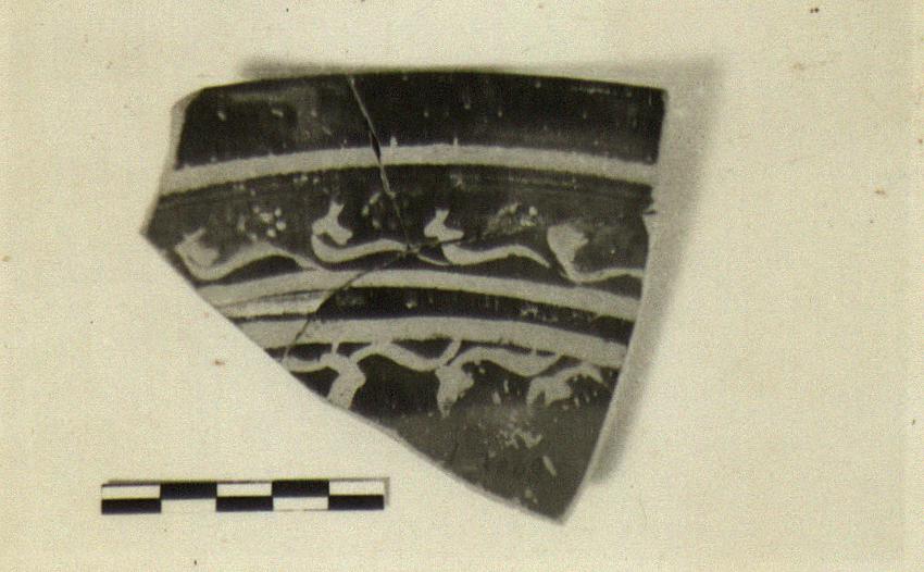 | Description: | Three shallow grooves outside. Below rim inside, wide incised band below, a row of dot rosettes in white; leaf-pattern above and below a triple line - all in terracotta paint, but the middle line in white. Glaze black to red. | |