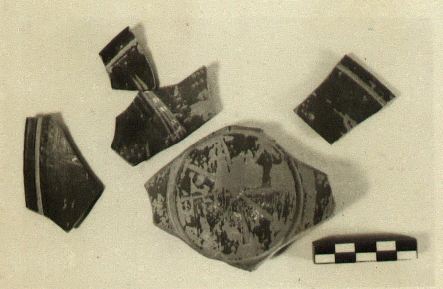 | Description: | Four non-joining fragments. Low ring foot; groove around center of floor which is decorated with double cross in thin clay paint. Incised band around inside of rim; on body sheaves and dots in thin clay paint and white. Red to black glaze, much peeled. | |