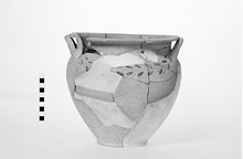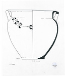 | Description: | Profile complete, many pieces missing; restored in plaster. Low flat base, convex body; nearly straight neck, and flat projecting rim. Horizontal loop handles, shoulder to rim. Rather coarse pinkish buff clay with white grits, slipped outside and decorated on the shoulder with a wreath of leaves and berries in brown. | |