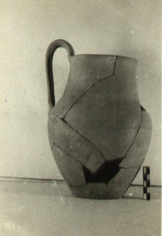 | Description: | Flat-bottomed with convex-concave profile, wide mouth and plain round lip. One vertical strap handle, looped high from rim to shoulder. Pinkish buff clay. | |