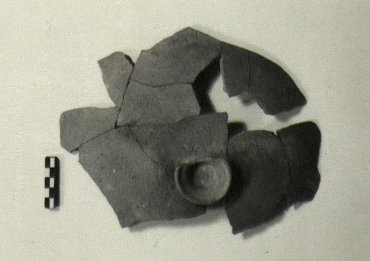 | Description: | Shallow convex lid, none of the rim preserved; restored in plaster. Flaring foot-like handle. Outside, covered with shallow concentric grooves. Coarse gritty gray clay, burned. | |