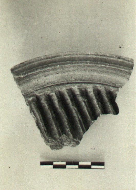| Description: | From a shallow casserole(?) with rolled rim. The bottom grooved; a mould?. Coarse gritty micaceous red clay, burned outside. | |